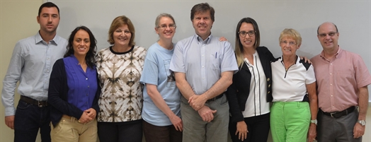 Left to right: Mr. Leandro Vilela Reis, Prof. Patrícia Duarte de Oliveira Paiva, Prof. Maria Laene Carvalho, Dr. Lynnette Dirk, Dr. Bruce Downie, Dr. Izabel Costa Silva Neta, Ms. Barbara Willard, Prof. Renato Paiva. A delegation from the University of Lavras, Minas Geras, Brazil, learning of the efforts of Leandro and Izabel on their respective projects. Taking the photo and not shown is Prof. Thelma Safadi, also of the delegation.